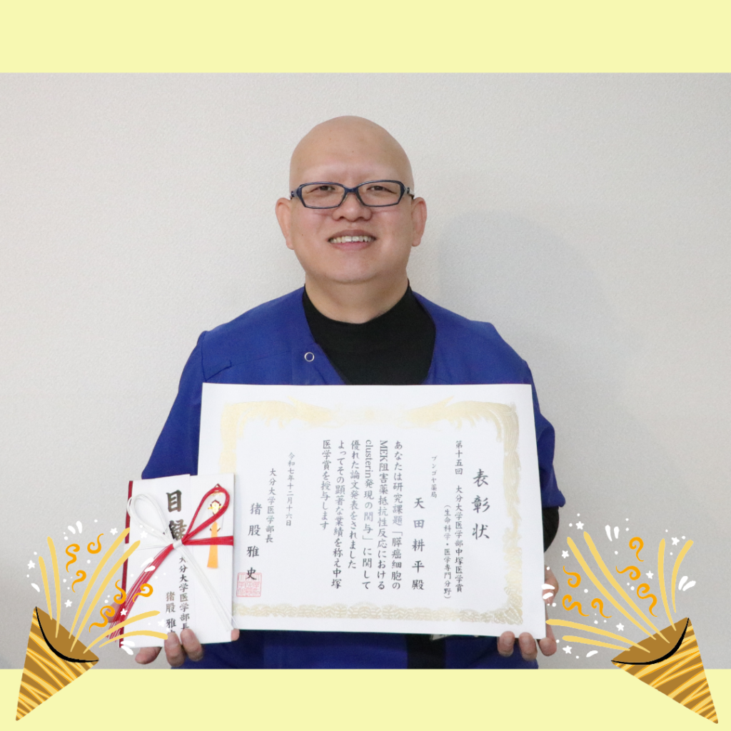 薬剤師の天田耕平さんが、第15回 大分大学医学部 中塚医学賞(大分大学医学部研究表彰)を受賞されました🎉